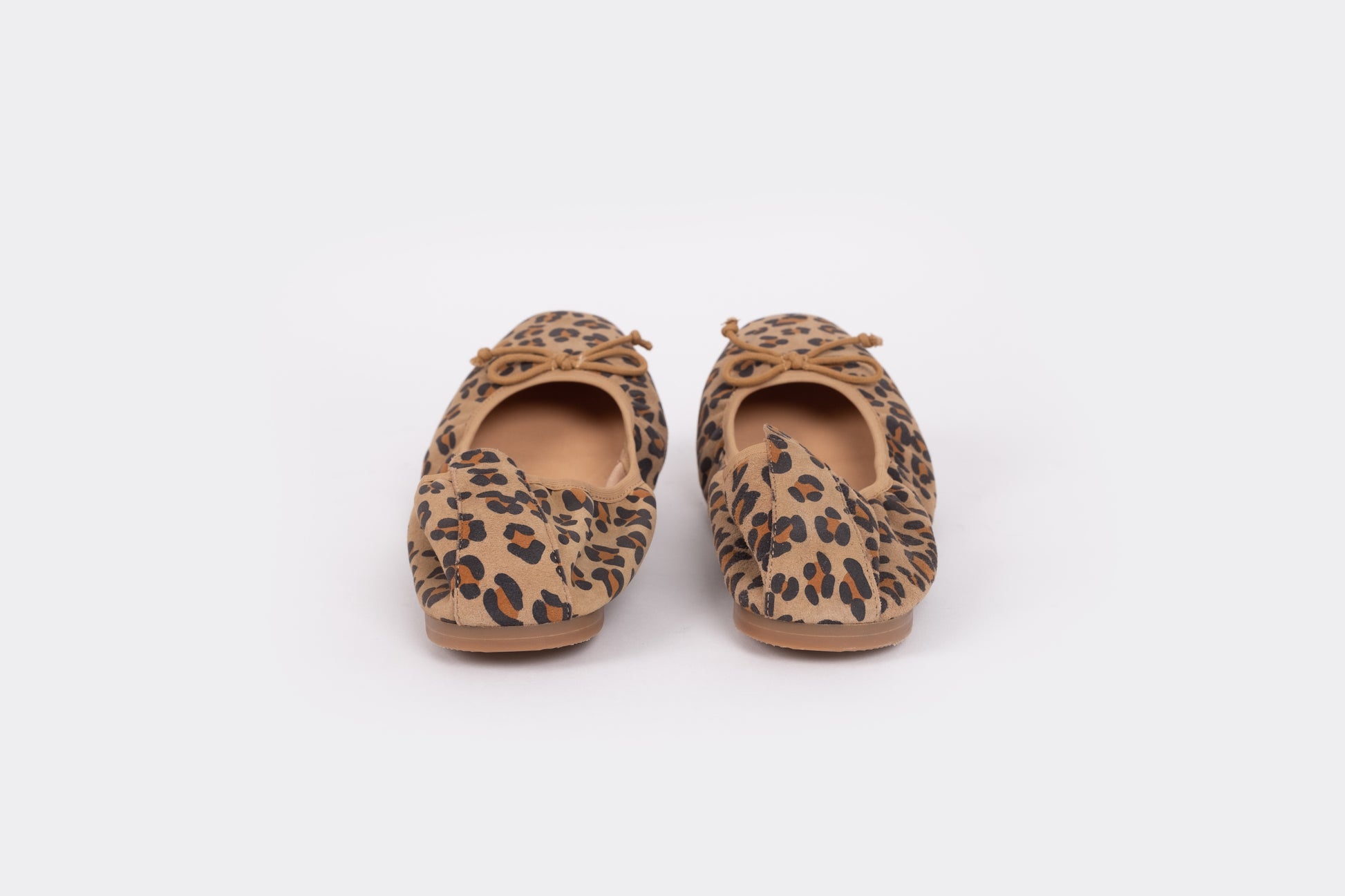 Olivia is a Parisian-style ballet flat, featuring a softly-squared toe and leopard suede upper. She has a super flexible sole and a comfort-stretch back. Perfect with cropped jeans and a chic blazer.
